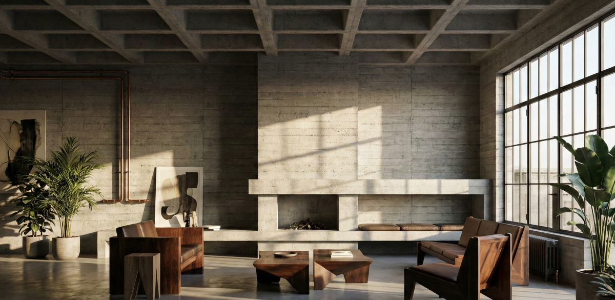 Brütalizm, bir “kaplama” stili değildir; yapının kendisidir. İç mekanlarda bu dürüstlüğü şöyle sağlıyoruz: