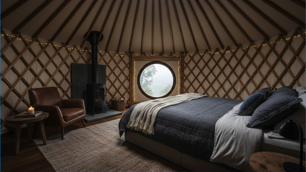 “İzmir Tire’de 36 m²’lik özel alanda, Yurt çadırı kurulumunun titiz teknik takibini ve özgün iç mekan tasarımını üstlendik. Ham ahşap detaylar ve bohem dokunuşlarla, doğanın tam kalbinde güvenli, konforlu ve estetik bir sığınak yarattık.”